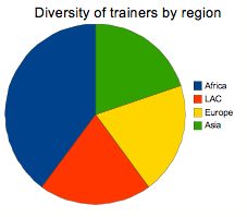 Las 16 capacitadoras eran mujeres, en su mayoría de África (Nigeria, República Democrática del Congo, Sudáfrica y Zimbabwe) y algunas de Reino Unido, Fidji, Bulgaria, Malasia y Filipinas. Fueron seleccionadas en base a sus conocimientos y su experiencia en la organización de cursos de mediana y gran escala, así como a su visión del feminismo y la conexión con la tecnología.