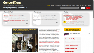 Les diverses réalités, besoins et priorités des femmes sont souvent exclus dans les discussions pour former un internet ouvert et transformateur. GenderIT.org est un site séminal qui cherche à répondre à ce manque et apporter des réflexions féministes sur les politiques de l’internet.